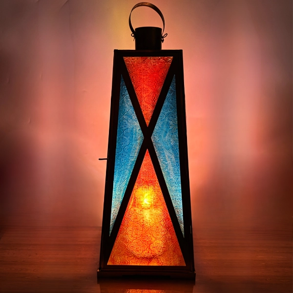 Square Shape with Dual Glass Colors – Unique square design with one side red glass and the other side blue glass for a vibrant festive look. A perfect decorative lantern for Ramadan decorations, Eid table decoration, outdoor lantern, or indoor Arabic lamp.