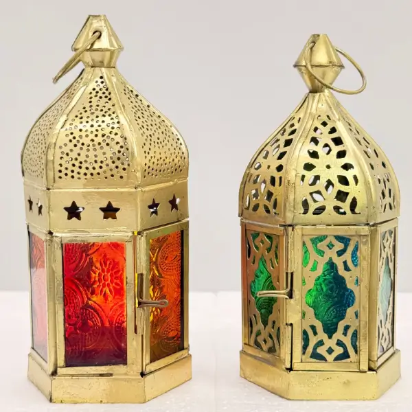Set of 2 Lanterns – This pack includes two colorful lanterns in different sizes. One has sky blue & green glass, and the other has red & yellow glass, both framed in shiny gold metal. Perfect Size & Light Weight – Lanterns measure 15x7x7 cm and 16x9x9 cm, light in weight (350 gm), easy to place on a table, shelf, or balcony, or hang as Ramadan decorations lanterns.